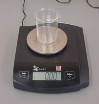 Place the beaker on the electronic balance. Press the REZERO (or TARE) button to reset the reading to '0' |